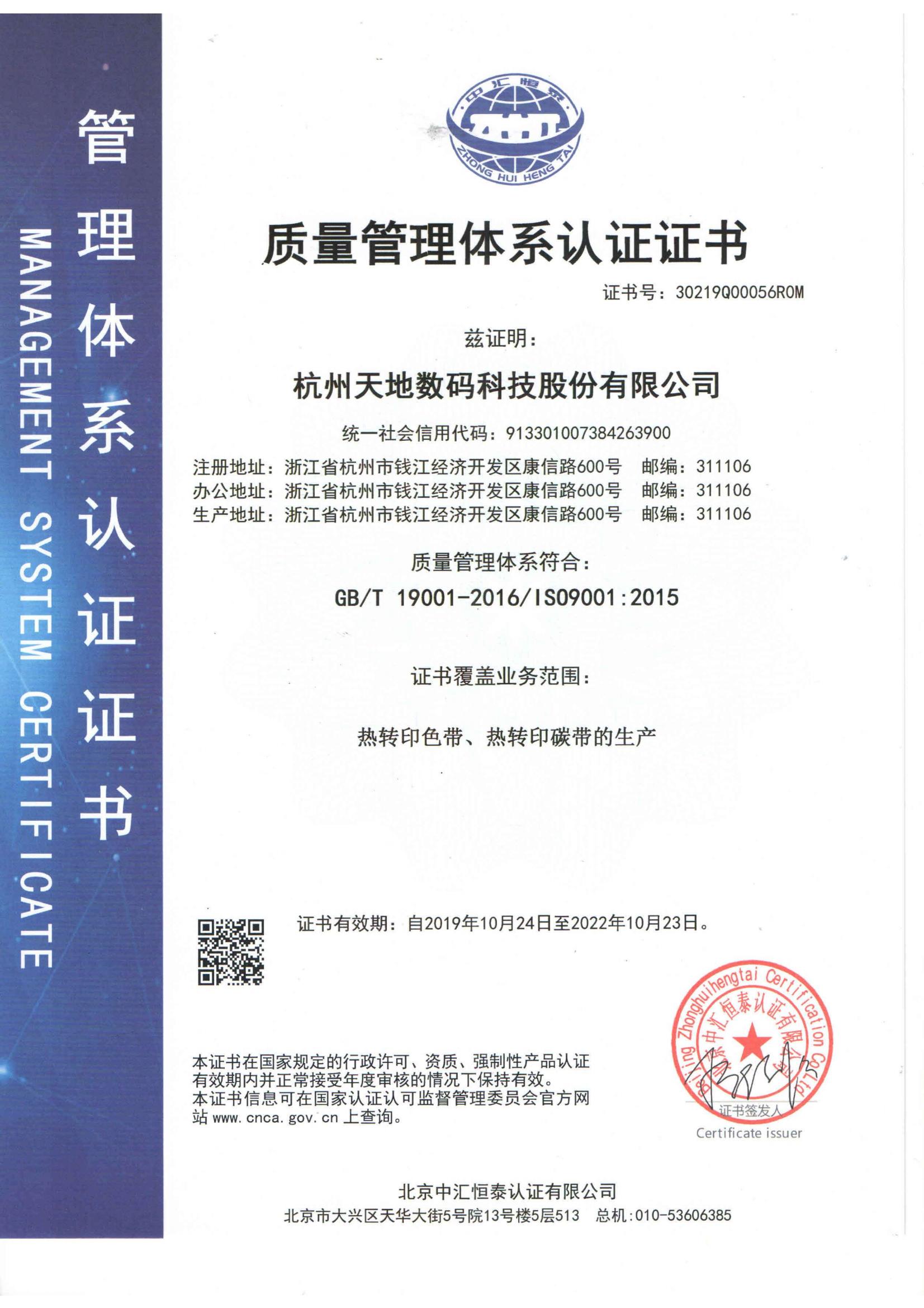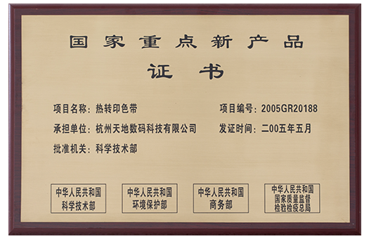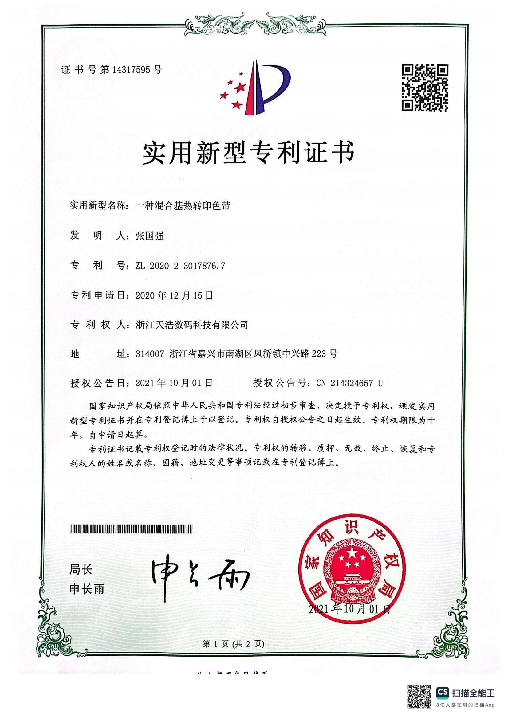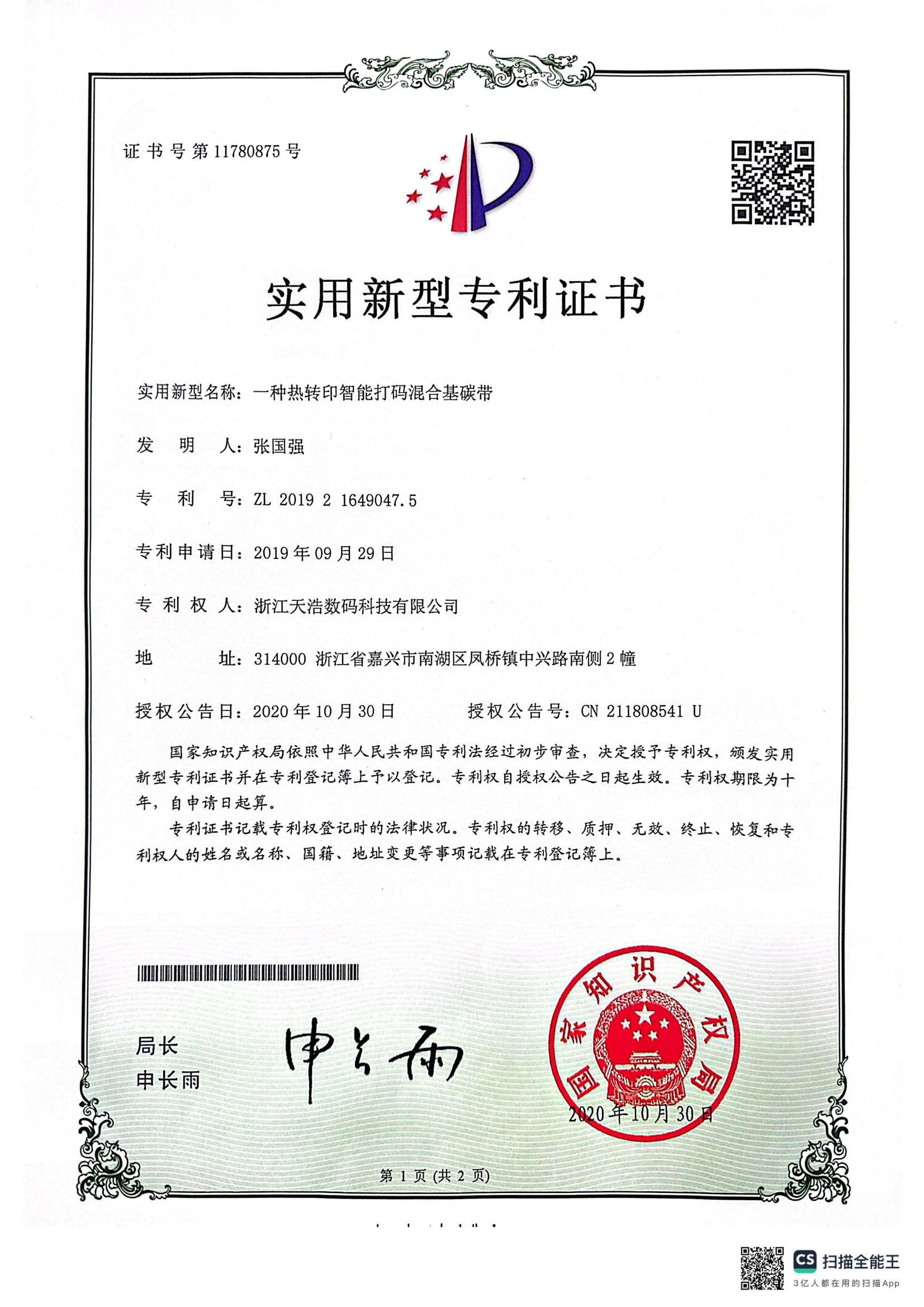 一種熱轉印智能打碼混合基碳帶實用新型專利證書