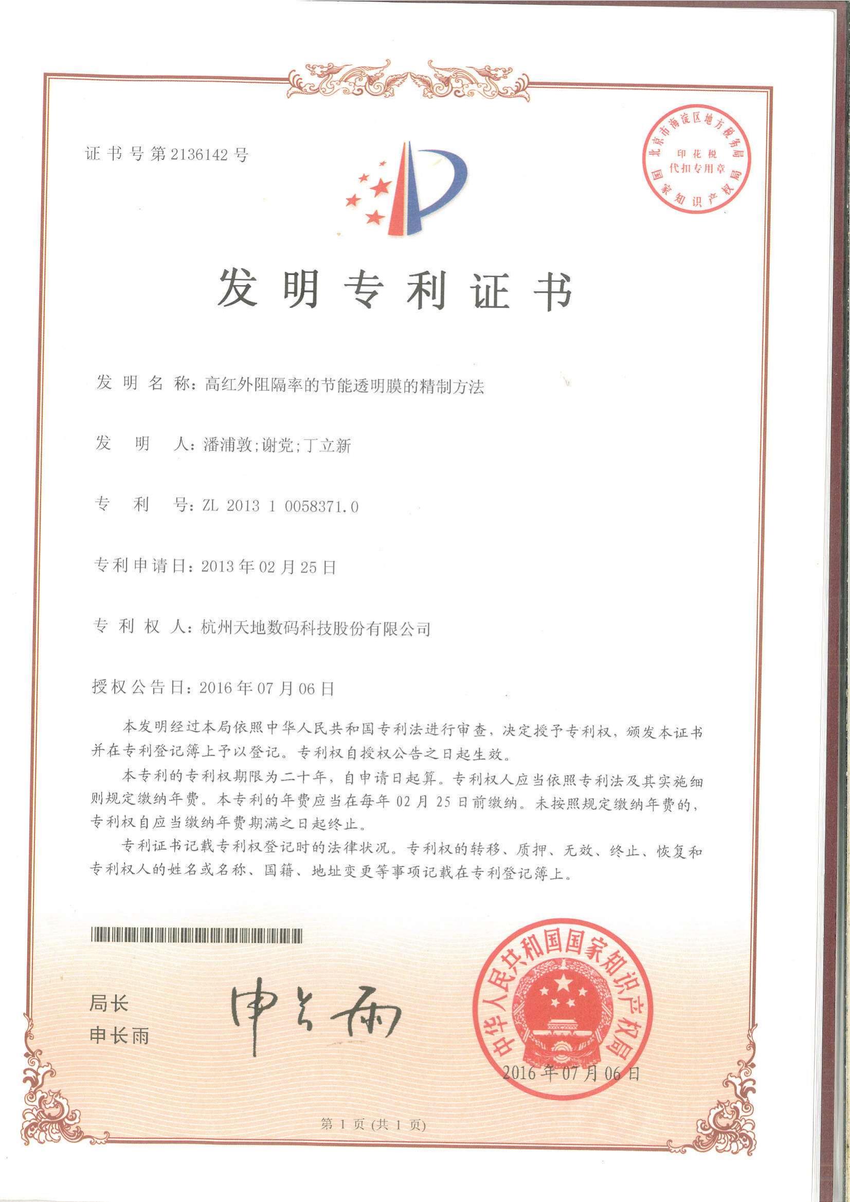 高紅外阻隔率的節(jié)能透明膜的精制方法發(fā)明專利證書