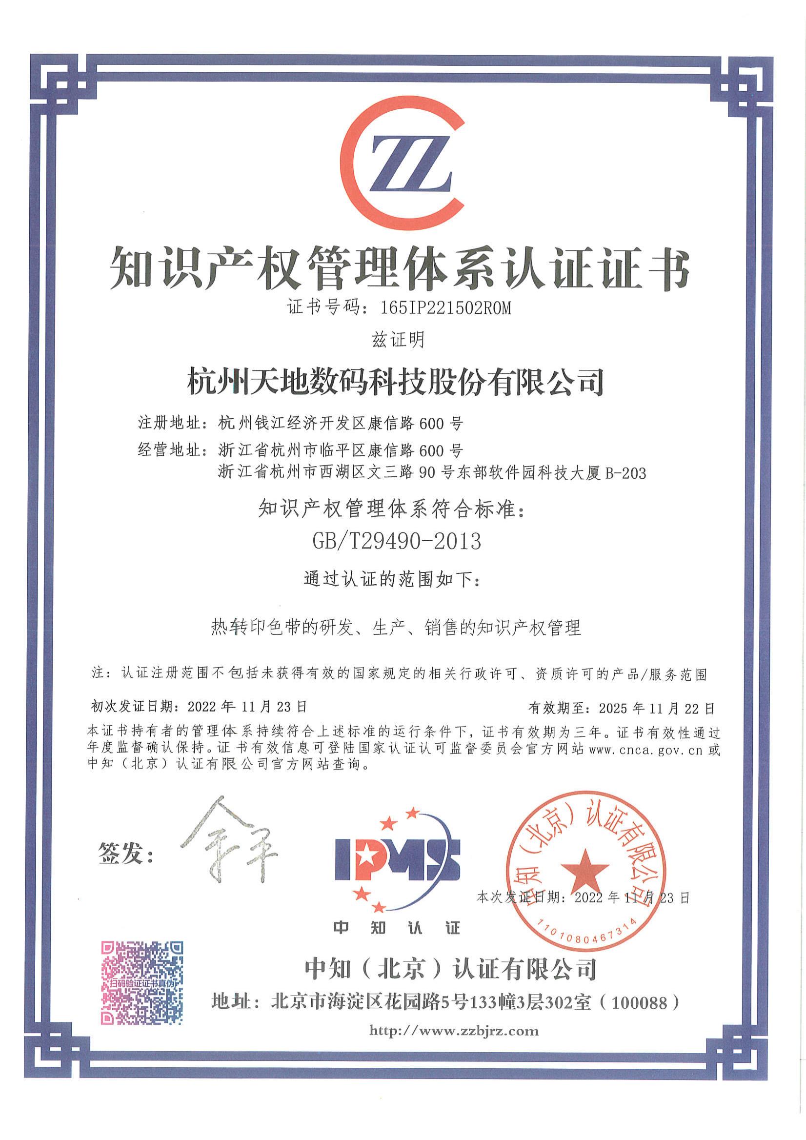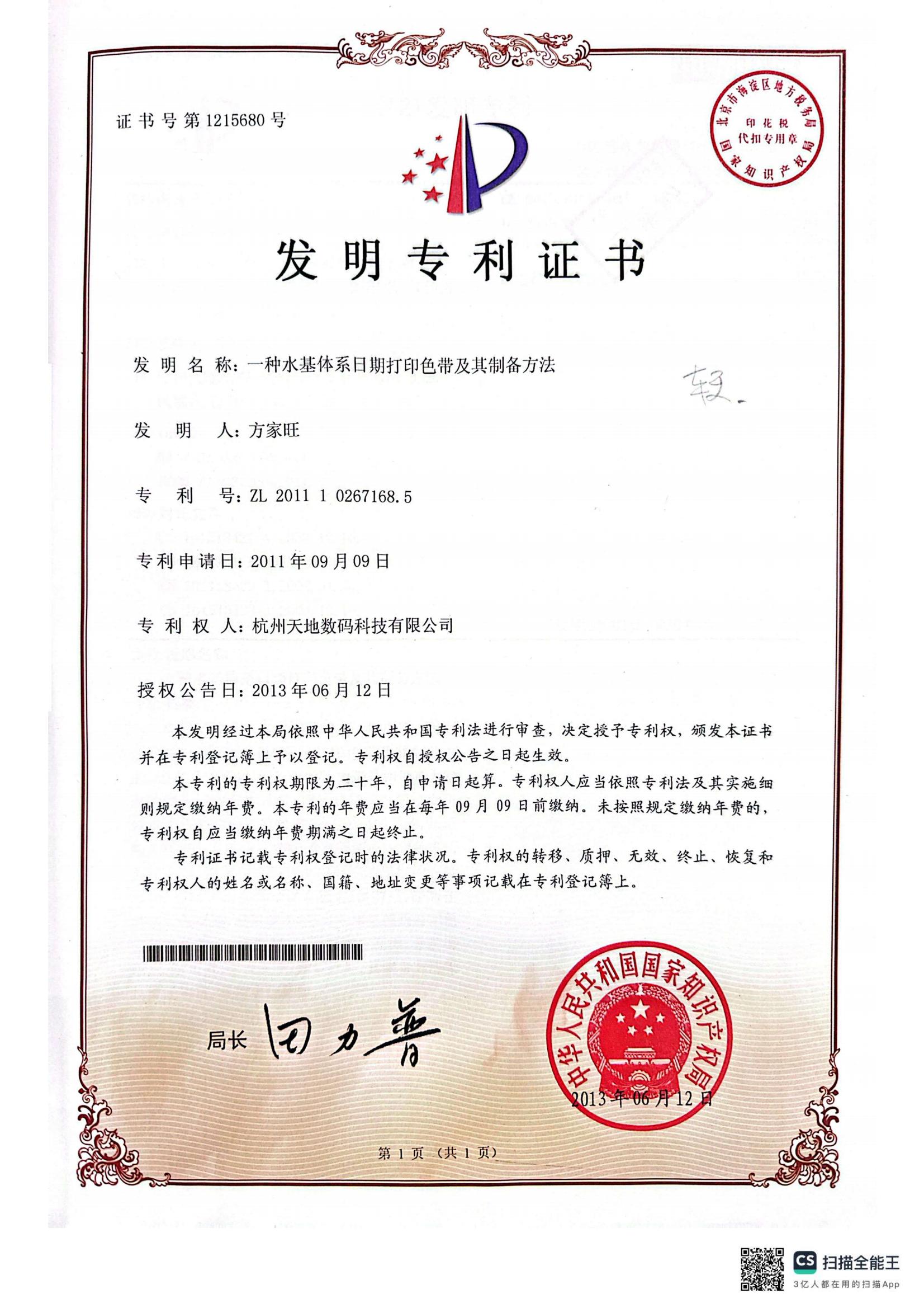 一種水基體系日期打印色帶及其制備方法發(fā)明專利證書