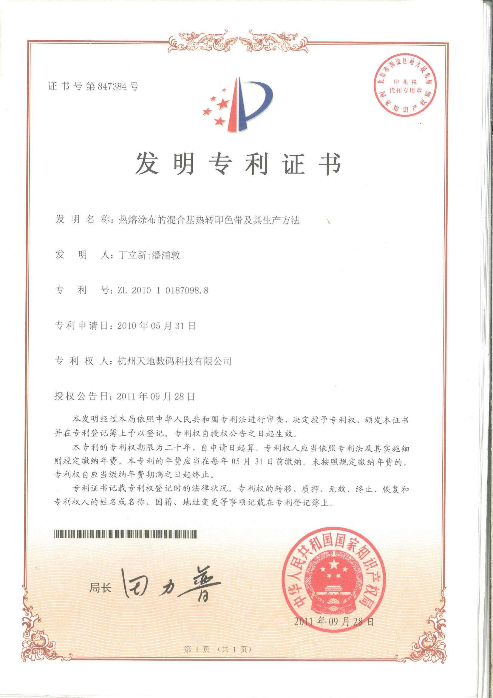 熱熔涂布的混合基熱轉印色帶及其生產(chǎn)方法發(fā)明專利證書