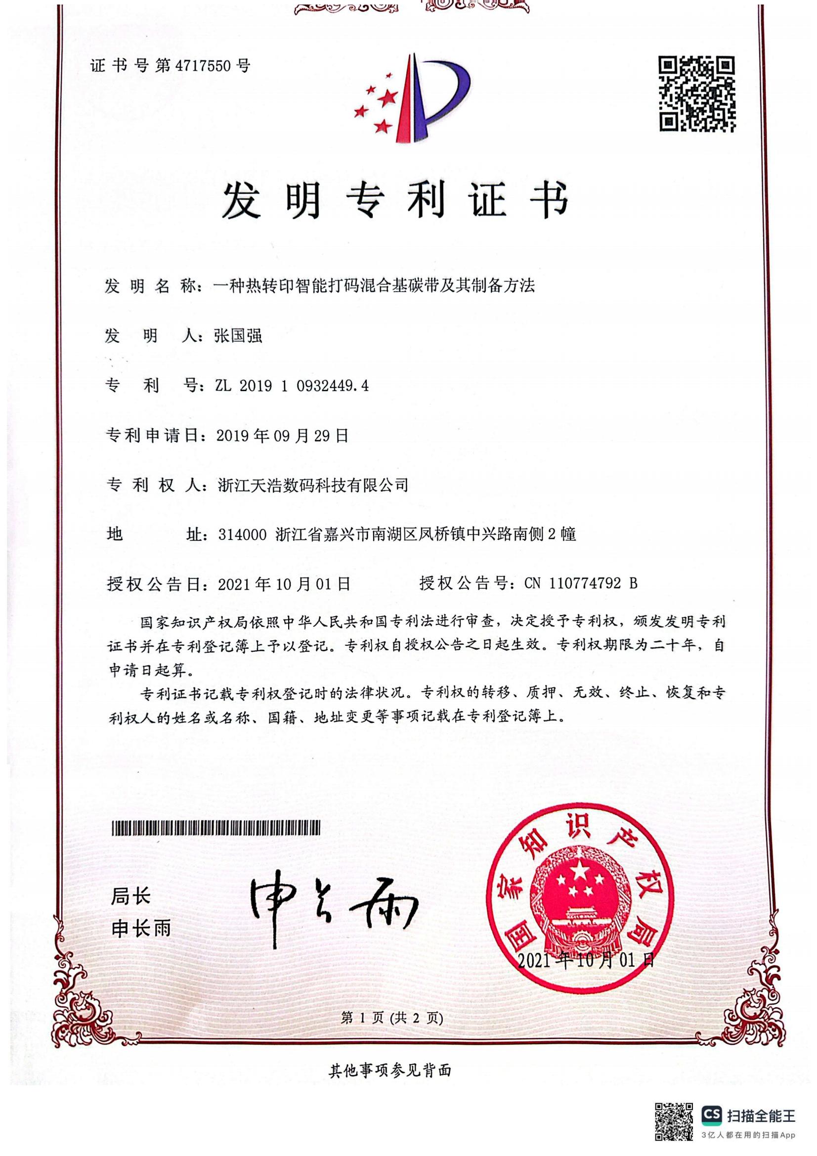 一種熱轉印智能打碼混合基碳帶及其制備方法發(fā)明專利證書