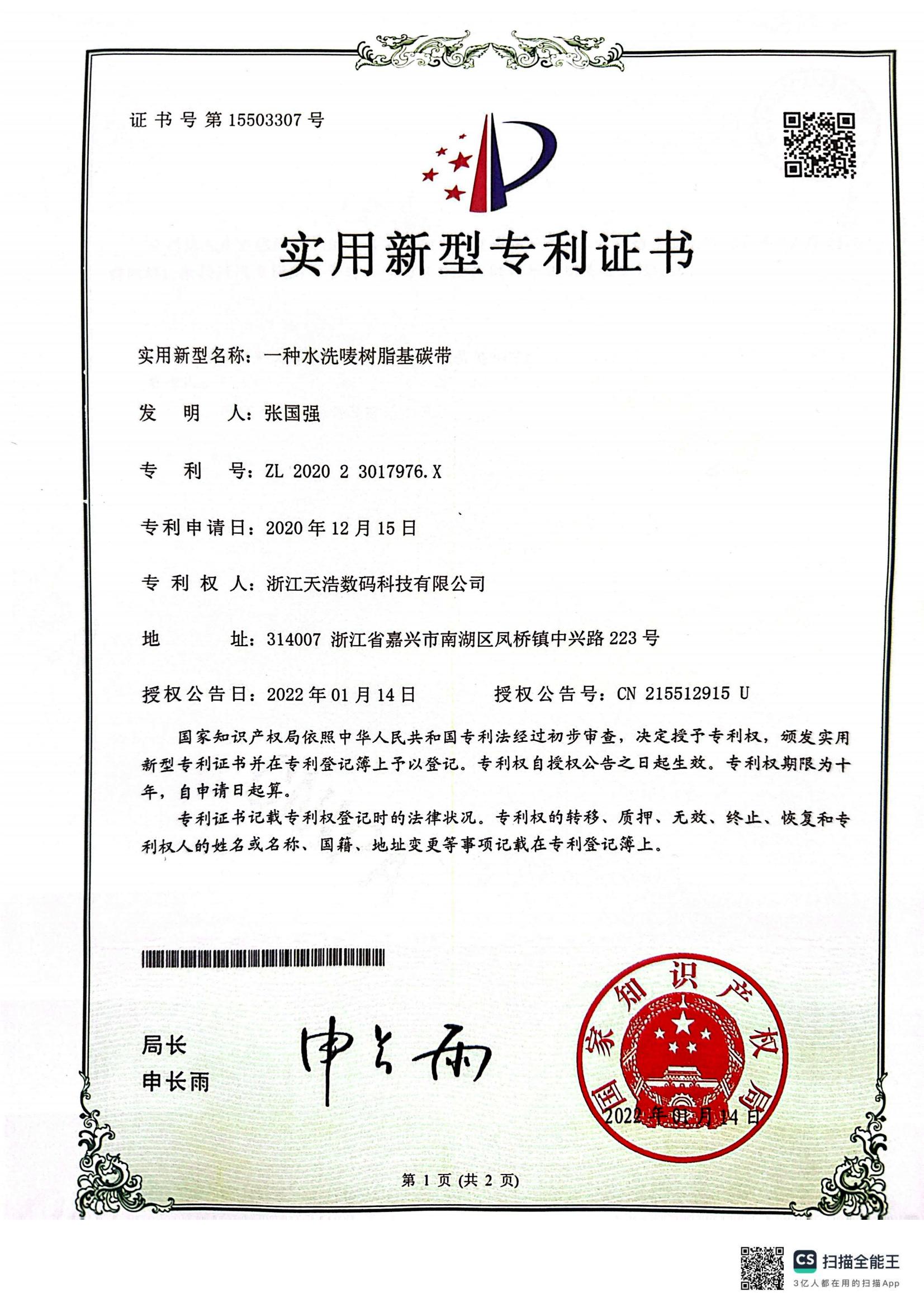一種水洗嘜樹脂基碳帶實用新型專利證書