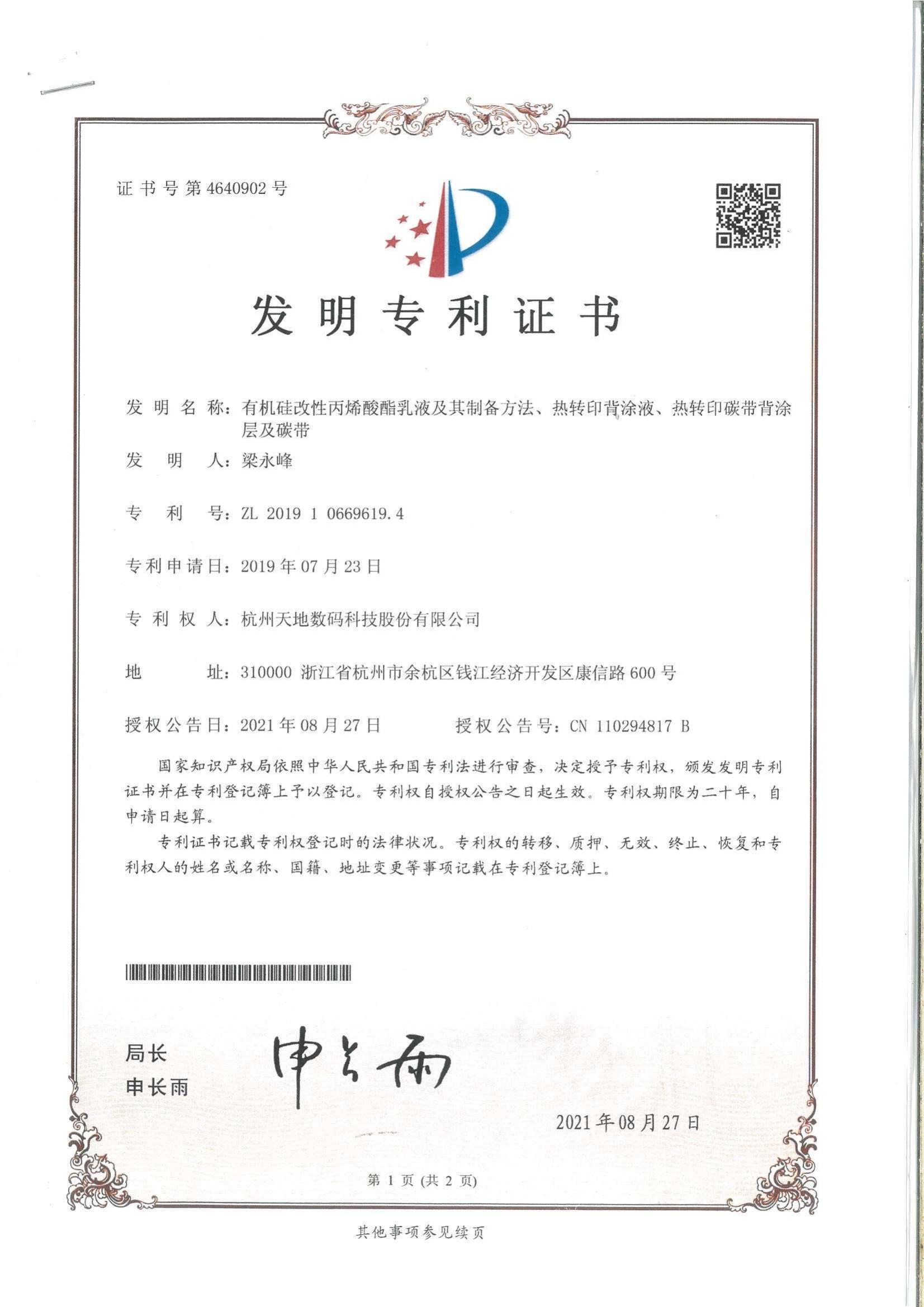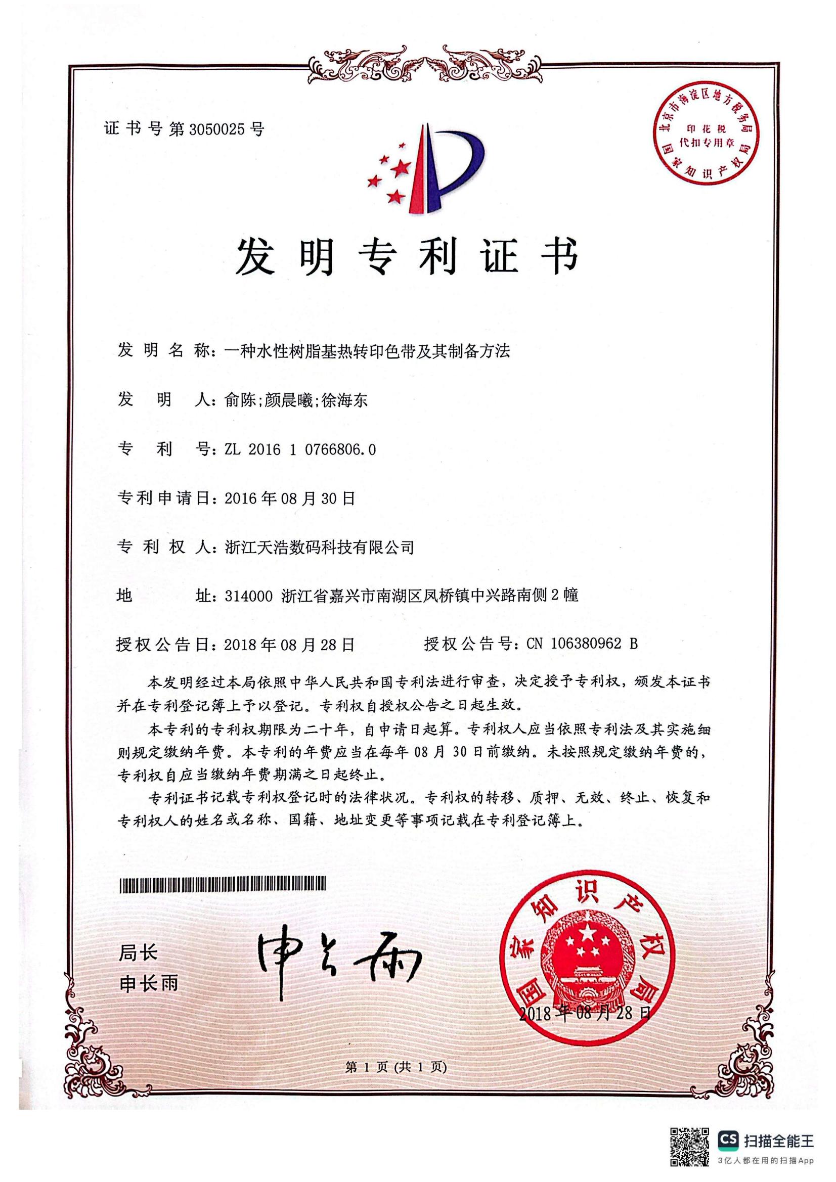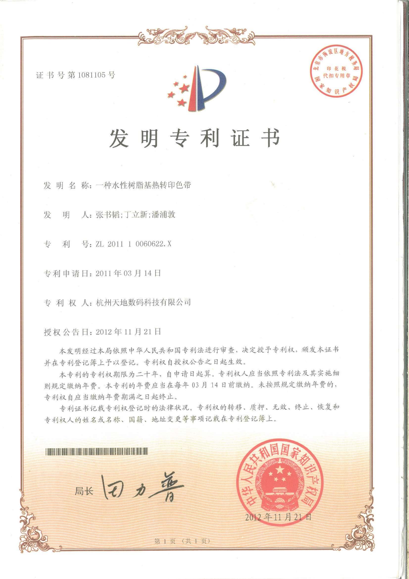 一種水性樹脂基熱轉印色帶發(fā)明專利證書