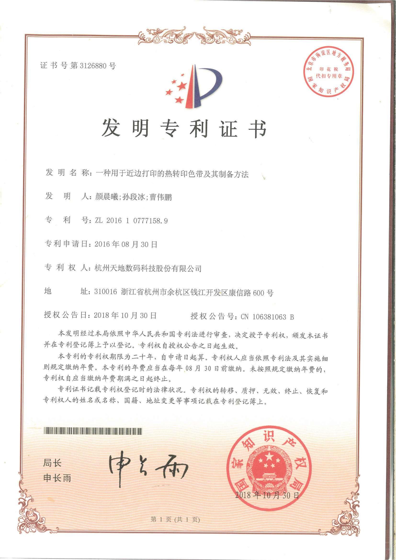 一種用于近邊打印的熱轉印色帶及其制備方法發(fā)明專利證書