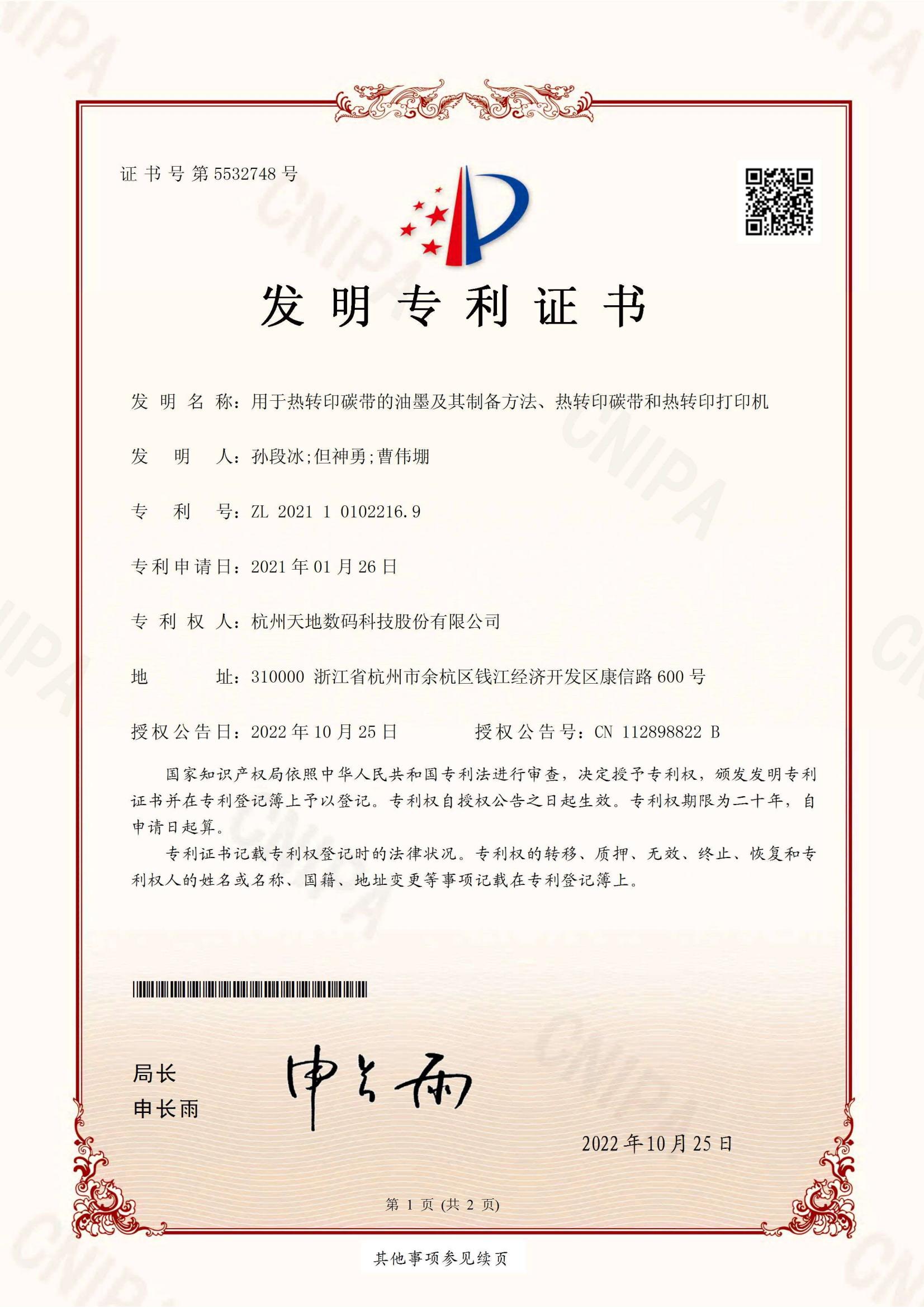 用于熱轉印碳帶的油墨及其制備方法、熱轉印碳帶和熱轉印打印機發(fā)明專利證書